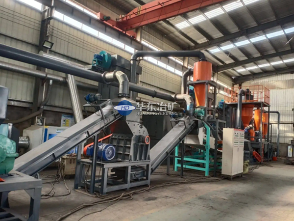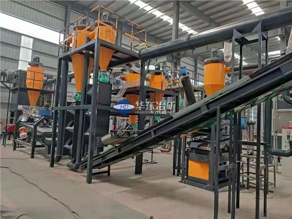 報(bào)廢鋰電池由輸送機(jī)送入一級(jí)撕碎機(jī)中進(jìn)行撕碎,撕碎后的物料通過(guò)輸送機(jī)送入二級(jí)多刀破碎機(jī)中進(jìn)行第二次破碎,二次破碎后的物料進(jìn)入到輸送機(jī)中同時(shí)設(shè)置磁選設(shè)備,可以將物料中的鐵分選出來(lái)。分選后的物料經(jīng)輸送機(jī)送入氣流分選機(jī),通過(guò)引風(fēng)機(jī)和旋風(fēng)下料器把正負(fù)極中的隔膜紙分離出來(lái),把分選后的正負(fù)極片進(jìn)入到三級(jí)粉碎機(jī)中進(jìn)行細(xì)碎,將物料粉碎到20目左右。粉碎后的物料由負(fù)壓系統(tǒng)進(jìn)入到旋風(fēng)分離器中進(jìn)行粉塵過(guò)濾,并通過(guò)兩次氣流分選,使不同密度的物質(zhì)進(jìn)行分層,然后得到正負(fù)極材料與銅、鋁、鎳等材料,而所有的超細(xì)粉塵由負(fù)壓系統(tǒng)帶入脈沖除塵器中進(jìn)行收集。而過(guò)濾得到的尾氣將繼續(xù)由負(fù)壓系統(tǒng)送入到尾氣處理設(shè)備中進(jìn)行空氣凈化,使之達(dá)到國(guó)家排放標(biāo)準(zhǔn)后再進(jìn)行高空排放。