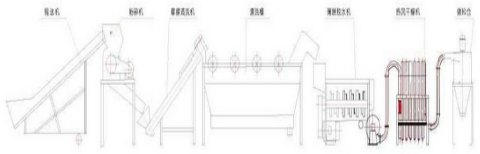 由輸送機(jī)將原料送至破碎,預(yù)碎機(jī)已速比1:35的超低轉(zhuǎn)速,用雙刀盤將塑料撕裂,切碎至3-10CM片狀,然后將片狀原料送至,二次粉碎機(jī),通過合金刀盤的高速轉(zhuǎn)動(dòng)將其破碎,粉碎機(jī)底部有出料篩網(wǎng),可根據(jù)需要控制出料尺寸,出料后,由水力清洗機(jī)對塑料進(jìn)行清理,再由脫水機(jī)進(jìn)行脫水作業(yè),脫水后的塑料顆?梢灾苯铀椭,氣流烘干送至料倉,作為再生塑料備料儲(chǔ)存。