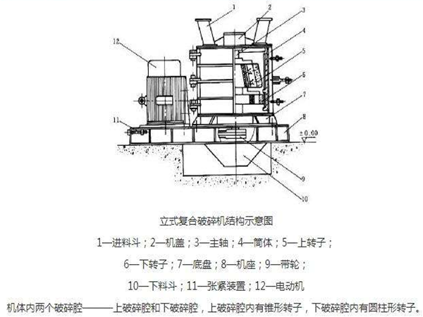 立軸復合式破碎機組成:立軸復合式破碎機主要由進料斗,機蓋,主軸,簡體,上轉(zhuǎn)子,下轉(zhuǎn)子,底座,機座,帶輪,下料斗,張緊裝置,電動機等部件組成。